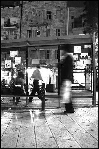 לדעתי התמונה היתה מתאימה לצילום רוחב ולא לאורך, השחור לבן מתאים והשילוב של סטטיות מול מריחת תנועה משולב טוב בפריים (הנערה היושבת בתחנת אוטובוס מול תנועת הגברים) גם אהבתי את התפיסה כי יש אדם בתוך התחנה מאחורי התחנה ולפני... תפיסה טובה.