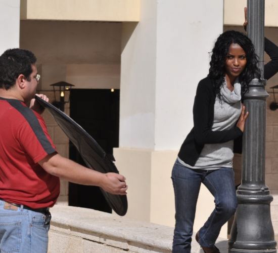 מאפרת עובדת על הדוגמנית / מצולמת, מאפרת אותה ומתאימה גווני איפור ללבוש ולקונספט