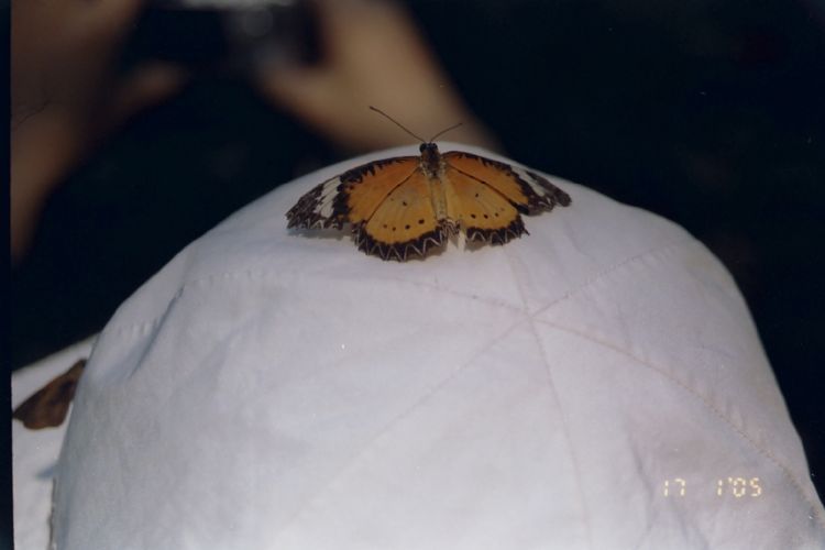 הפרפר יושב על כובע של ההולך לפני.