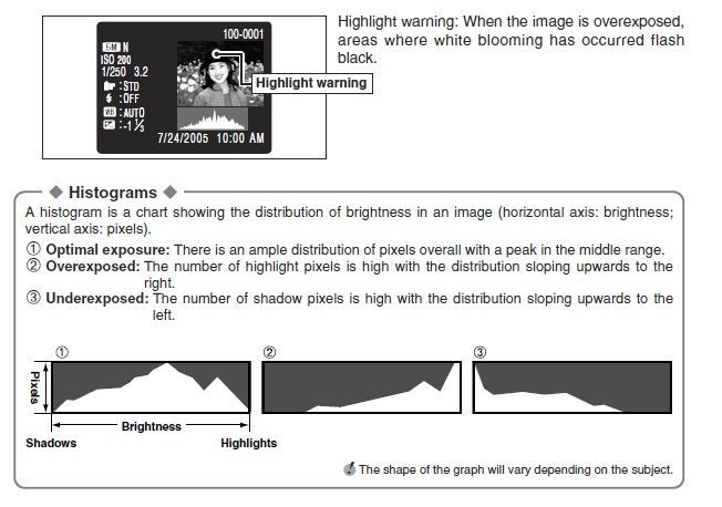 1. בזמן הצילום - בצפיה במסך לפני הצילום או מייד אחריו - כוון את המצלמה (עם כפתור DISP או INFO או משהו כזה) שהיא תראה לך על המסך את ההיסטוגרמה. אם הצד הימני (הלבן) של ההסטוגרמה יותר מדי מלא אז יהיו לך חלקים שרופים.