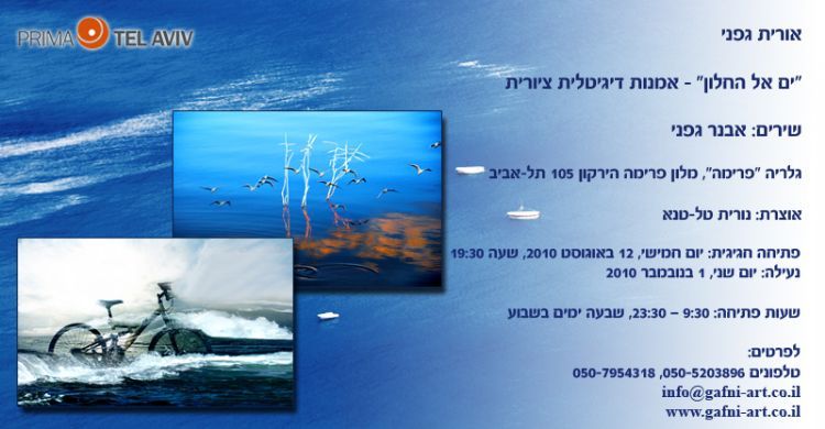 ים אל החלון - יש דבר כזה... תערוכת יחיד שלי בשם "ים אל החלון" (אמנות דיגיטלית) תיפתח ב-12 באוגוסט בשעה 19:30 במלון פרימה בל-אביב - מול הים !