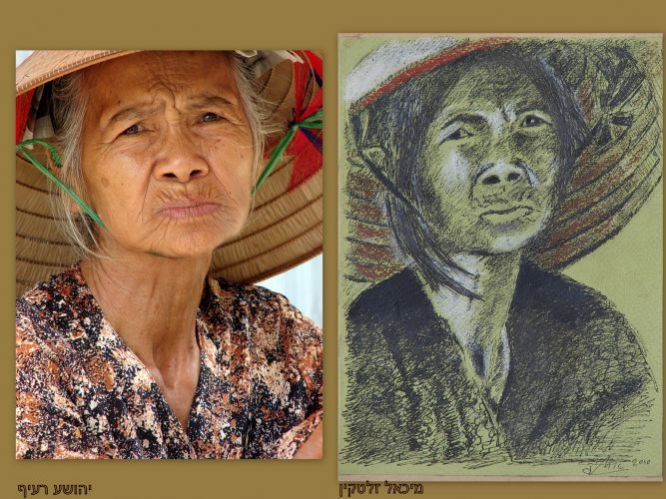 בהמשך להודעה שלי למטה מה-4.11 אני מצרף כאן עבודה נוספת במסגרת הדו-שיח שאני מנהל עם חברי הצייר. ניתן לראות שהוא הפך את רוכלת המדרכה שצילמתי לאכרה בשדה אורז. אשמח לתגובותיכם.