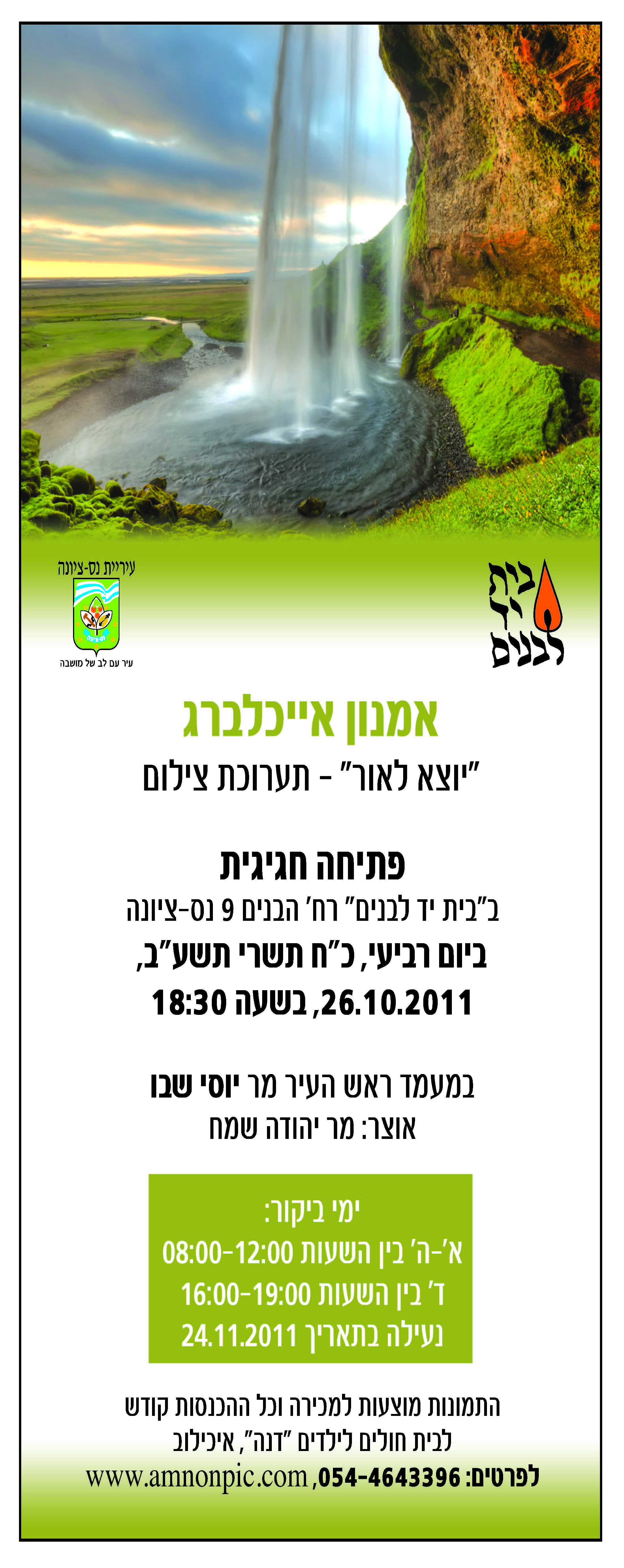 לכל מי שמכיר אותי, ב- 26/10 ב-שעה 18:30 בבית יד לבנים , רחוב הבנים 9 נס ציונה במעמד ראש העיר , אני עורך תערוכה של מיטב הצילומים שלי העוסקים באור. כך שכל מי שרוצה לראות את מיטב הצילומים המוכרים מהאתר ומודפסים ובגדול אני יותר מאשמח שיחלוק איתי את החויה. יש גם מטרה לתערוכה, הצילומים הודפסו כאמור ברמת הדפסה מאד גבוהה ובגדלים יחסית גדולים . כל הצילומים עומדים למכירה כאשר תמורת המכירה כולה תרשם לפקודת בית חולים לילדים דנה והתורמים יוכלו לקבל אישור תרומה מבית החולים על תרומתם. כך שאם אתם מכירים גם קונים/פוטנציאלים אשמח אם תיידעו אותם בדבר התערוכה.