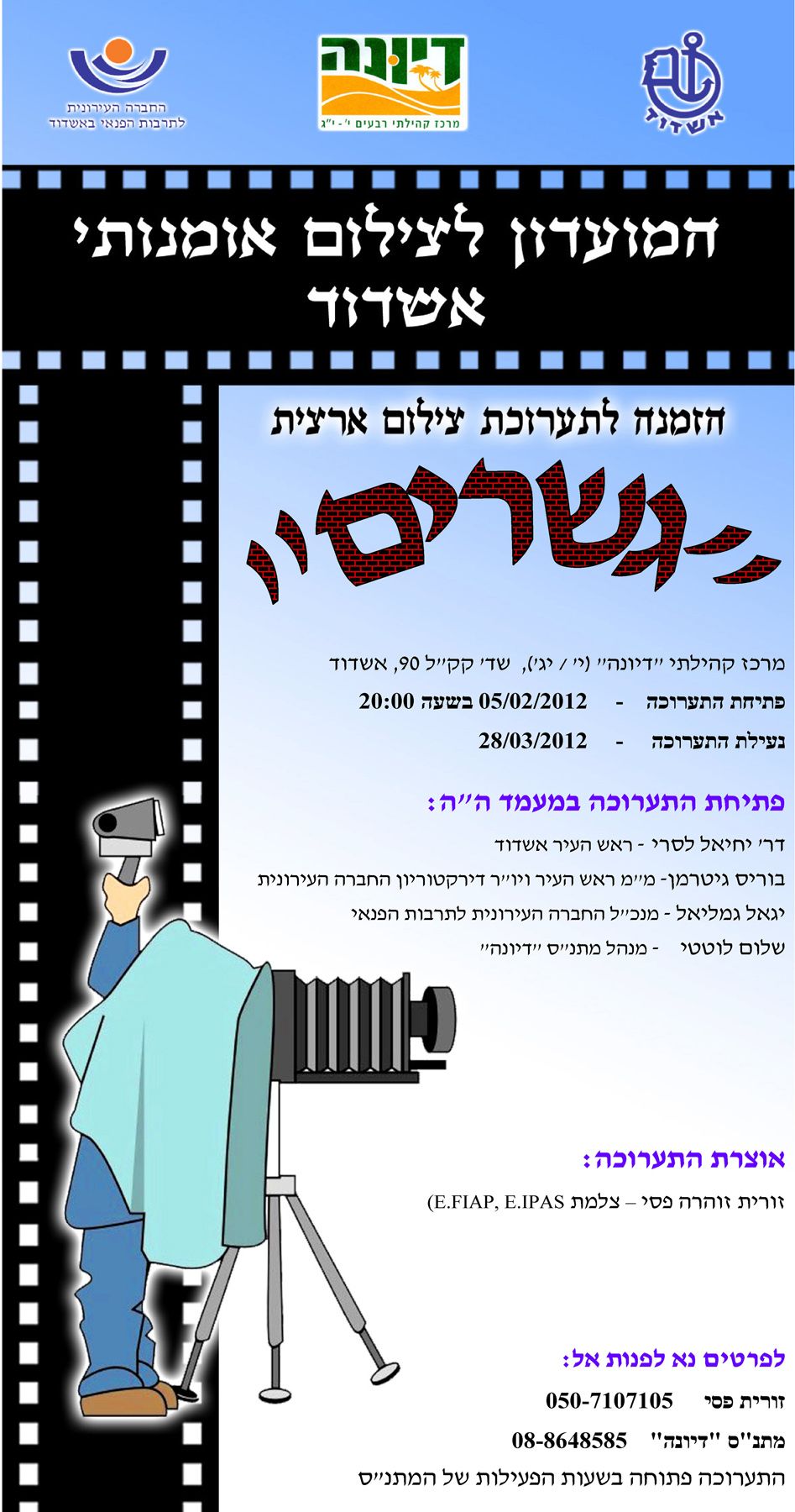 אני שמח להזמינכם לתערוכת צילומים בנושא "גשרים" במועדון לצילום אמנותי אשדוד, שתתקיים במתנס "דיונה" החל מ 5.2 ועד 28.3.