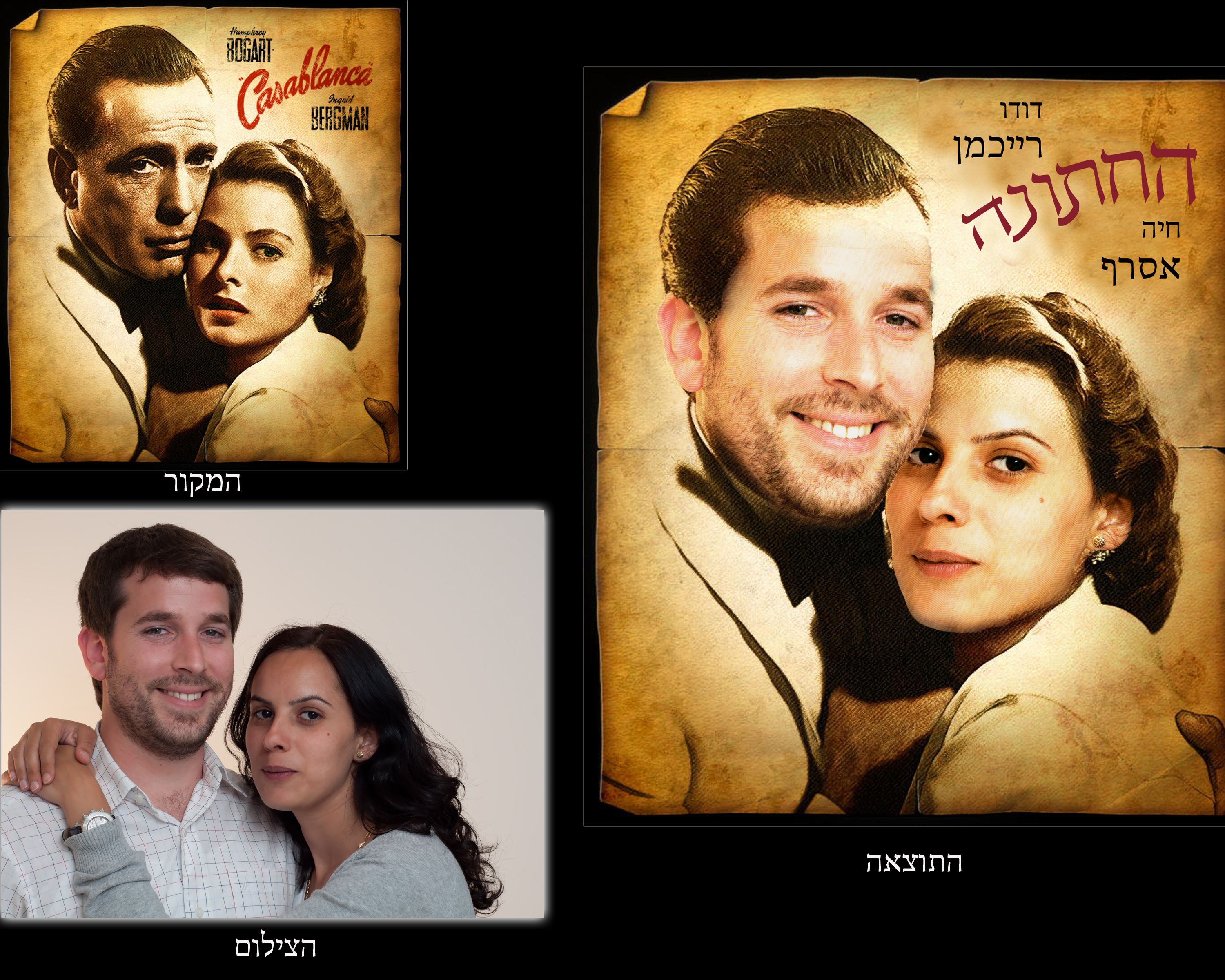 הזמנת חתונה מהסרטים רציתי לשתף אתכם בפרוייקט מהנה ביותר שסיימתי לא מזמןהרקע הוא חתונה מתקרבת של אחותה של אשתי.מתוך רצון לתרום הצעתי לייצר להם הזמנה מקורית. בחרנו בפוסטר ישן מתוך הסרט "קזבלנקה" עשינו ערב צילומים אחד וקצת שיחקנו עם התאורה כדי לנסותלהגיע לצבעוניות דומה.לבסוף ערכתי את התמונה בפוטושופ תוך התאמת צבעים עם צבעי התמונה המקורית והוספה של פילטר שיצר את הקווים האלכסוניים על הפנים. וכך נוצרה הזמנה באווירה קולנועית.העבודה על התמונה עד לגרסה הסופית שהיתה מקובלת על כולםלקחה בערך שבוע. לאחר מכן שלחנו להדפסהועכשיו נשאר רק להתחתן.מזל טוב.