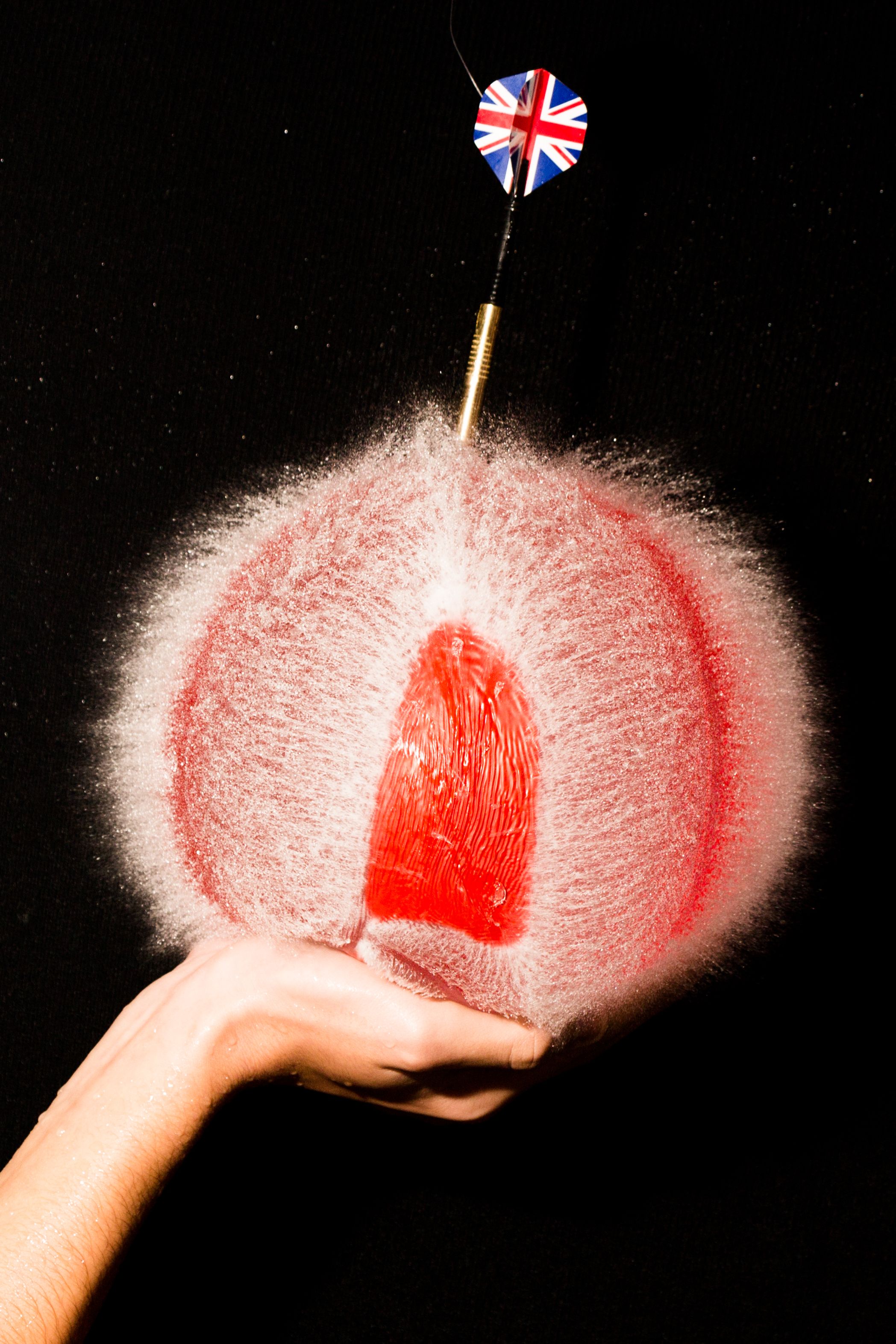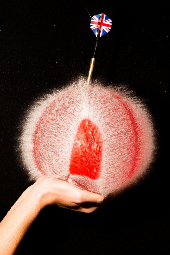 מצולם בלון מלא מים ברגע פיצוץ ע"י החץ מלמעלה.