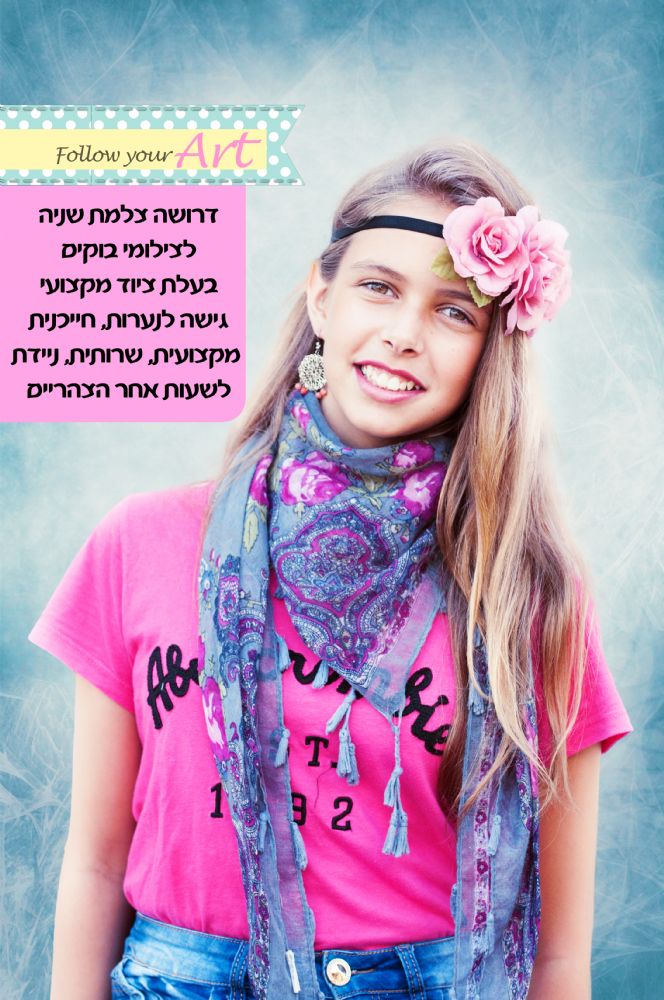 דרושה צלמת לצילום בוקים לבת מצוות ו/או צילום אירועים קטנים, בעלת קבלות, עם ציוד מקצועי, גישה לנערות, גישה לסטיילינג, ניידת, חייכנית, לבבית, שרותית, בחודשי הקיץ (בשעות הצהריים/ערב) ניתן לפנות אליי עם תיק עבודות לאימייל st.7987651@gmail.com תודה סיון צדוק