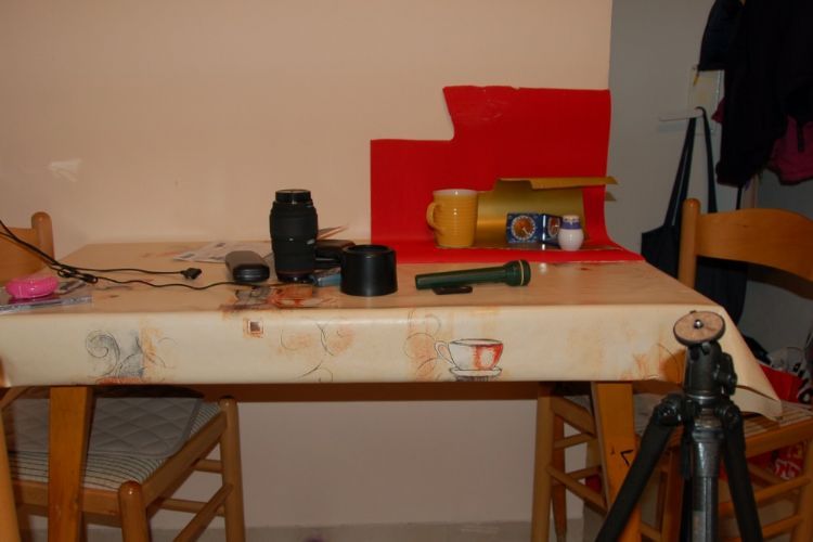 אפשר לראות את הפנס שאיתו הארתי את המצפן, את השלט, החצובה, את מחזיקי הרקע (הספל והמלחיה).