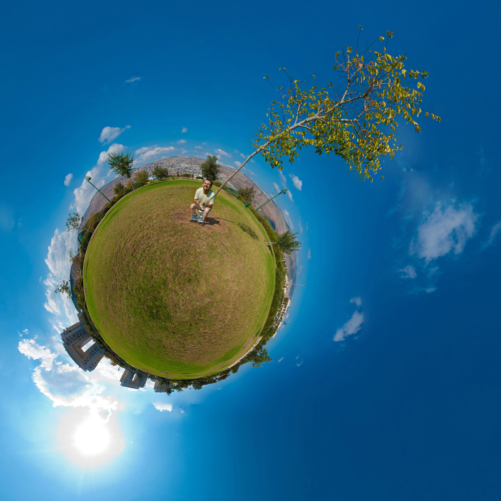 תמונה זאת בנויה כך שהקצה השמאלי מתחבר וממשיך את הקצה הימני ועל ידי זה נסגר מעגל. אני בחרתי שבתמונה האוהל הציליה והרכב יהיו במרכז, אך יכולתי לסובב את התמונה ולמקם במרכז משהו שונה. זהו סוג התמונה שנרצה לשמור עם נרצה לאחר מכן ליצור סיור וירטואלי (עוד פרטים בהמשך). עוד דבר שתוכנת ה פי.טי. גואי יודעת לעשות מצויין זה פנורמות עגולות או כוכבי לכת קטנים (Wee Planets). הנה אותה תמונה, עם אותם קווים שמייצגים את הרוחב והארוך. אך הפעם ביקשתי מהתוכנה ליצור כוכב לכת קטן. (השם בתוכנה ואולי תמונה)