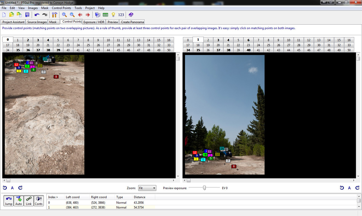בתמונה ניתן לראות בחלון השמאלי את תמונה מספר 0 ובחלון הימני את תמונה מספר 1. ניתן לראות גם את כל הנקודות המשותפות שהתוכנה מצאה בין התמונות (מסומנות במספרים וריבועים צבעוניים) עוד אפשר לשים לב שכל התמונות שהתוכנה מצאה בהם נקודות משותפות עם התמונה מסומנות על ידי מספר מודגש. למשל לתמונה 0 (השמאלית) יש נקודות משותפות עם התמונות הבאות: 1,3,4,6,34,35,37,38,40. ככל שיהיה יותר קשרים בין בתמונות זה יותר טוב מכיוון שזה ייצור חיבור יותר מדויק. ניתן להוסיף באופן ידני נקודות, אופציה זאת שימושית מאוד, זה מאפשר לנו כמשתמשים לשפר את התיאום בין התמונות. עכשיו שהתוכנה שמרה לעצמה את כל הקשרים בין התמונות היא יוצאת סוג של פאזל, שחלקיו הם התמונות, אבל בניגוד לפאזל רגיל, החלקים לא מתאימים בול אחד ליד השני אלא עולים אחד על השני וחופפים במקצת.