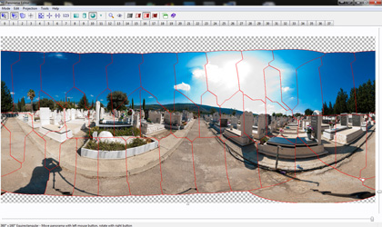ניתן לראות שהקו הרוחבי שמציג את כל הסיבוב נסגר עם עצמו והחתך לא מורגש בכלל. ניתן גם להפוך את הפנורמה ולבקש מהתוכנה לסגור אותה הפוך, מה שיוצר אפקט מנהרה, הנה אותה תמונה, שוב עם קווי האורך והרוחב, הפעם בסגירה הפוכה.