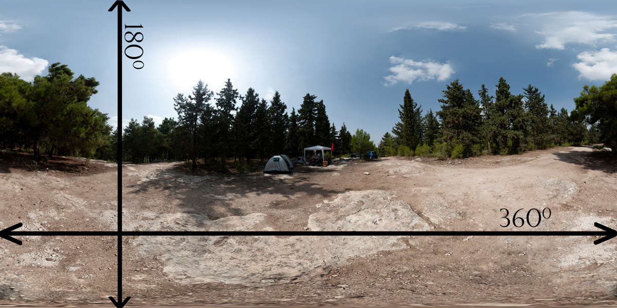 זה מאפשר לנו לשחק עם התמונה, והתוכנה תרכיב אותה מהחלקים לפי איך שנבקש. הדרך הנפוצה להציג פרומת 360 נקראת Equirectangular . זוהי תמונה שהרוחב שלה הוא 360 מעלות. והגובה שלה הוא 180 מעלות.