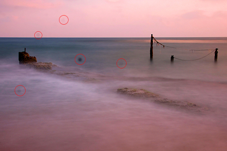 טיפ - בכדי לגלות לכלוכים אלו סגרו את הצמצם לערך הגבוה ביותר וצלמו קיר לבן ונקי. במידה ויש לכם לכלוכים על החיישן כך זה יראה: